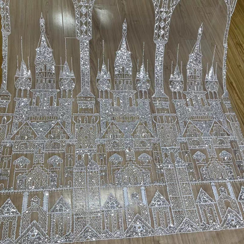 新款钉珠白色亮片刺绣立体城堡蕾丝面料布料婚纱礼服童装背景装饰