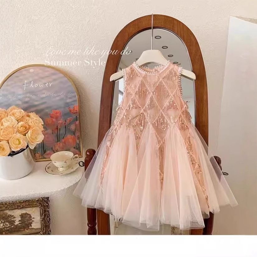 Gaun Anak Perempuan Musim Panas 2025 Rok Manik-manik Berpayet Anak Perempuan Model Baru Gaun Rok Putri Tanpa Lengan Elegan