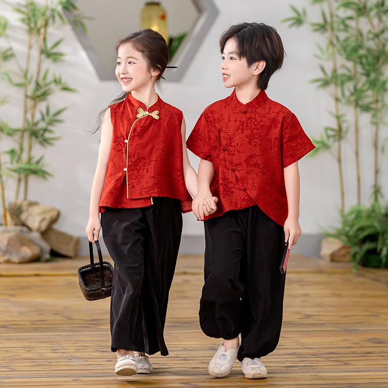Pakaian Hanfu Setelan Gaya Nasional Anak Laki-Laki Pakaian Tang Anak Perempuan Gaya Tiongkok Baru Pakaian Pertunjukan Warna Merah Gaya Antik Bayi