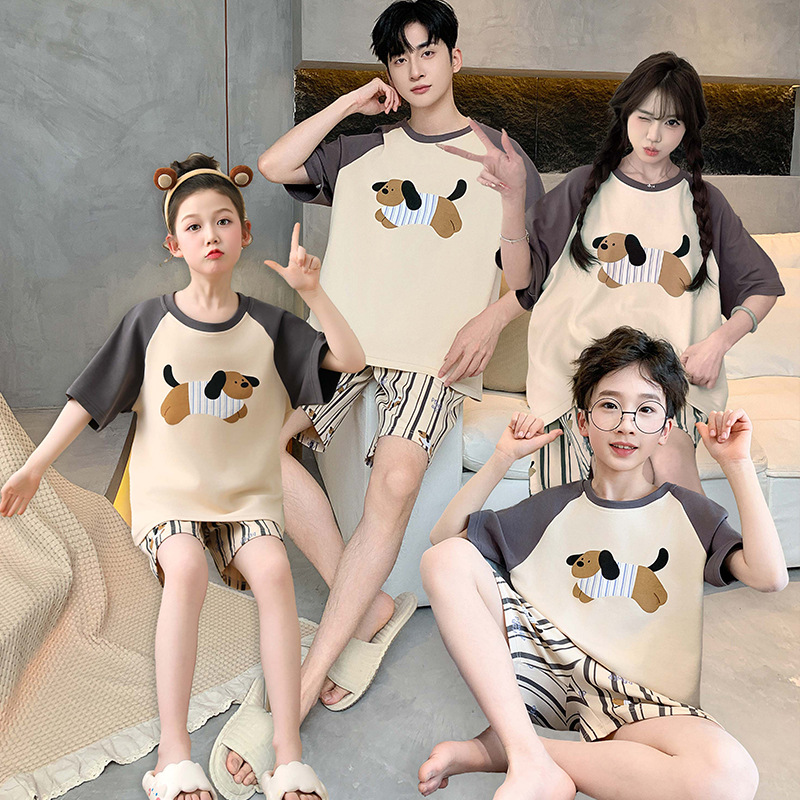 Keluarga Tiga Empat Piyama Ibu dan Anak Perempuan Katun Tulen Spongebob Musim Panas Lengan Pendek Pakaian Rumah Anak Kecil