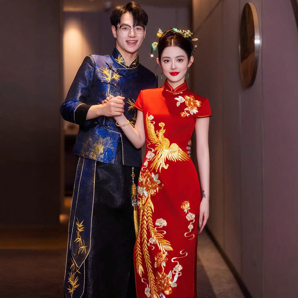 Gaun pesta malam 2025 baru model panjang slim-fit cheongsam Xiuhe gaun pengantin untuk resepsi pernikahan