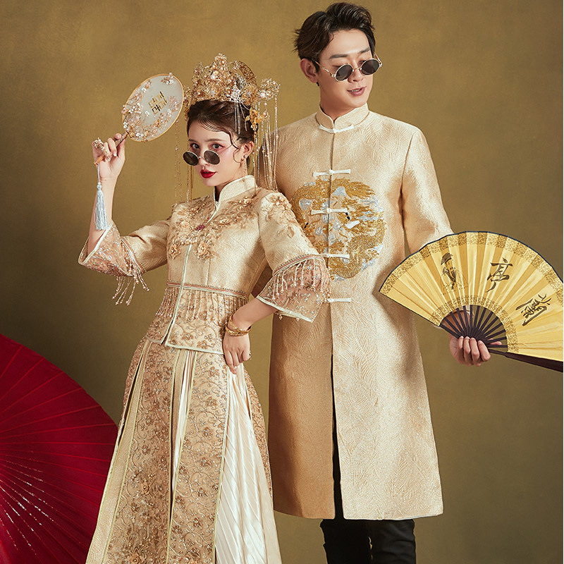 Gaun pasangan Xiuhe sampanye pengantin gaun roti Cina 2020 gaun naga musim panas baru dan phoenix gaun pernikahan gaya Cina tipis