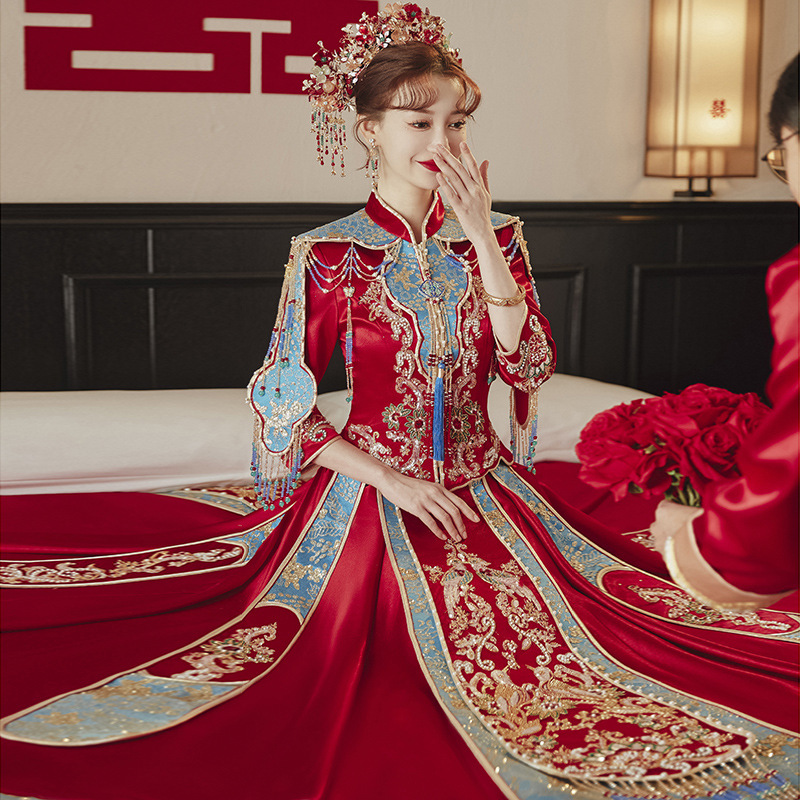 Selendang mewah Xiuhe gaun pengantin wanita, gaun pernikahan China canggih industri berat baru 2023 warna kontras merah dan biru Xiuhe