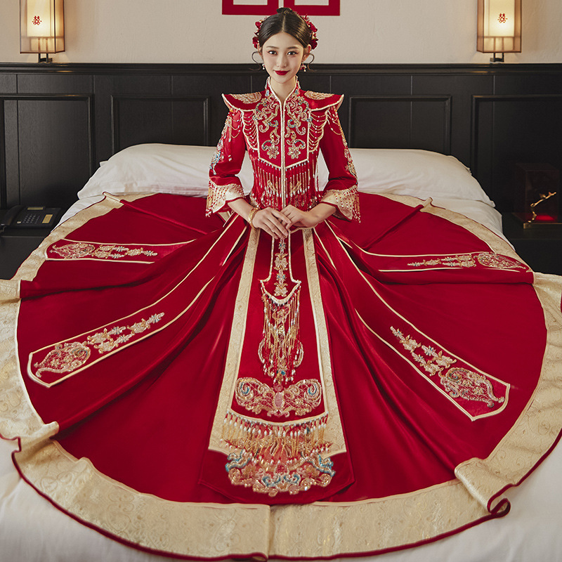 Gaun pengantin Xiuhe beludru tugas berat, gaun pernikahan Tiongkok, Gaun pelangsing pengantin, gaun roti bakar Musim Semi 2024