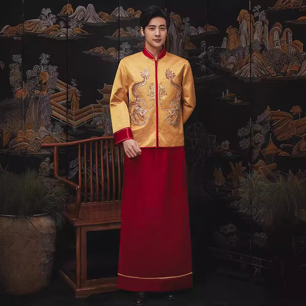 Wu Qilong pakaian pria Xiuhe, gaya yang sama, Gaun China Xiuhe pernikahan, rompi setelan Tang naga dan phoenix
