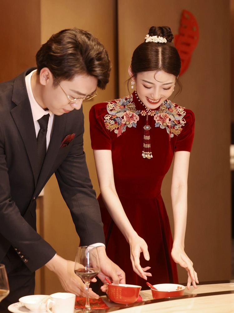 [Zhi Ya] gaun pengantin beludru Xiuwei, pakaian kerah v ukuran plus 2024, gaun pengantin pernikahan Cina baru