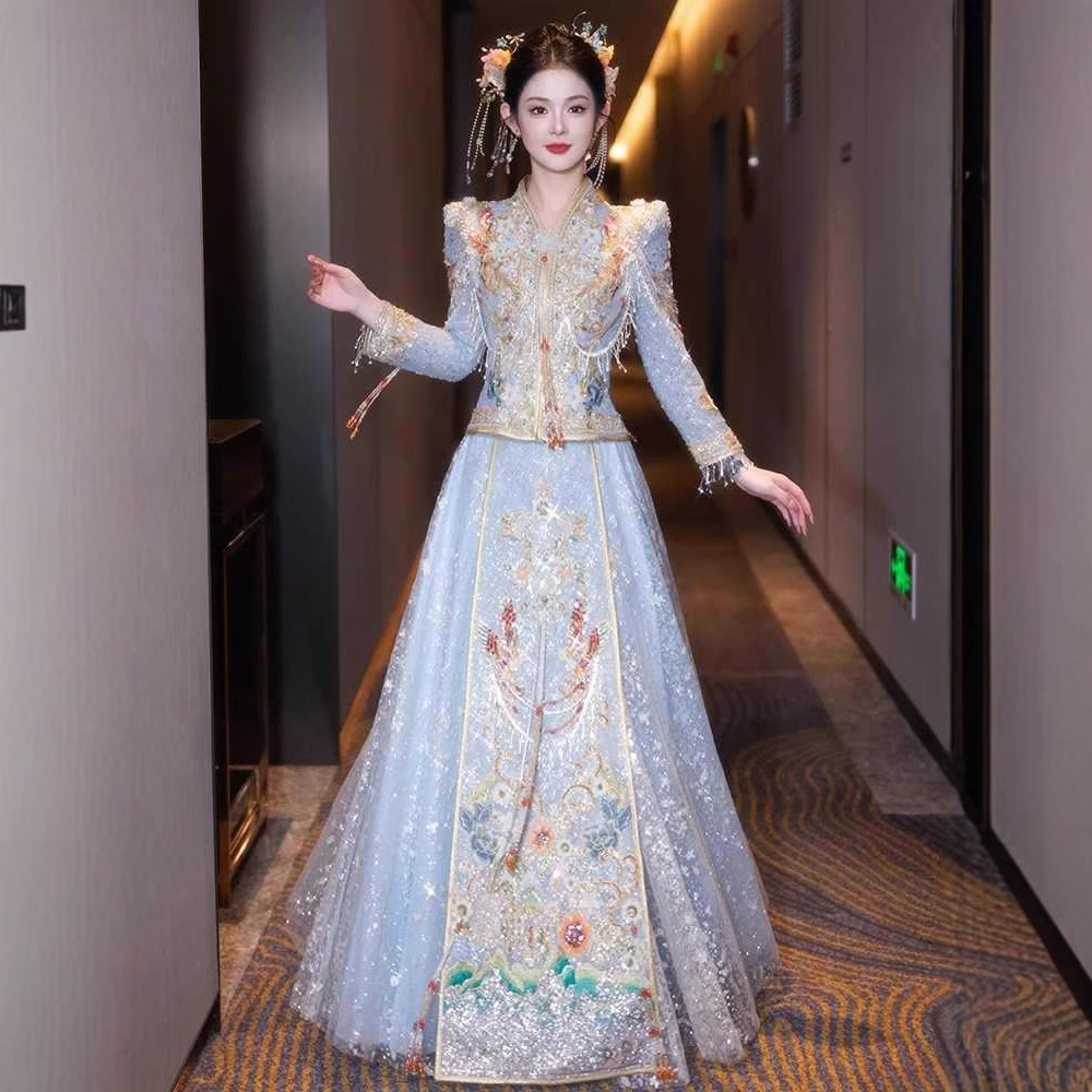 Pakaian Biru Xiu He Pakaian Pernikahan Model Baru 2025 Pakaian Pernikahan Pengantin Wanita Warna Muda Musim Panas Model Tipis Gaun Naga dan Phoenix