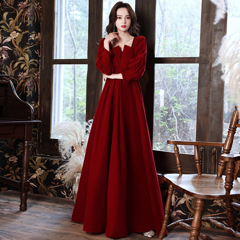 Pakaian Xiuhe Kelas Atas Pakaian Pernikahan Gaya Tiongkok Beludru Model Baru 2025 Pakaian Bersulang Terlihat Langsing Elegan Kerah V Gaun Musim Semi