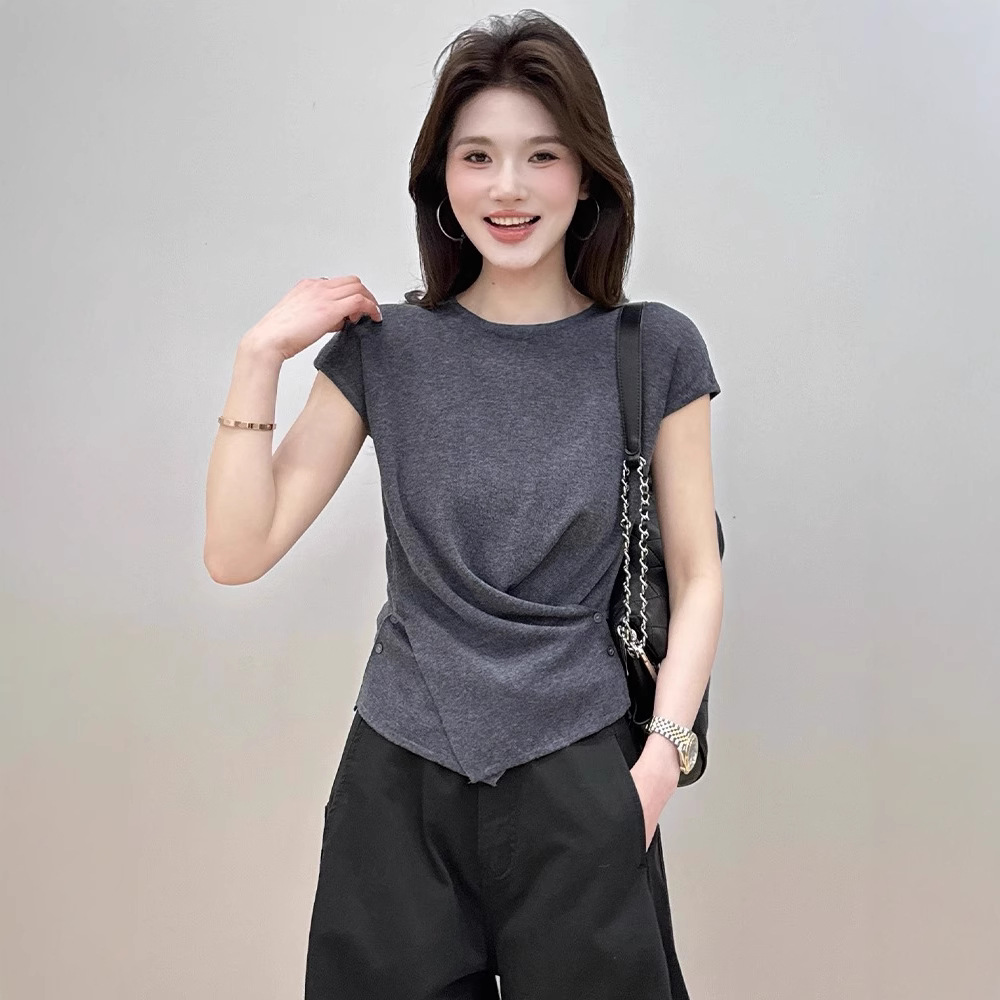 Atasan Membentuk Pinggang Gaya Desain Gaya Barat Modis Model Baru Musim Panas 2025 Wanita Sweater Sutra Es Lengan Pendek Kerah Bulat Tidak Beraturan