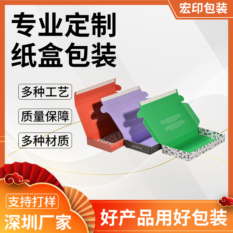 Kotak pesawat warna-warni dua sisi, kotak kemasan pakaian ekspres tiga lapis bergelombang model sobek, dibuat khusus dengan hot stamping UV untuk kemasan kebutuhan sehari-hari.