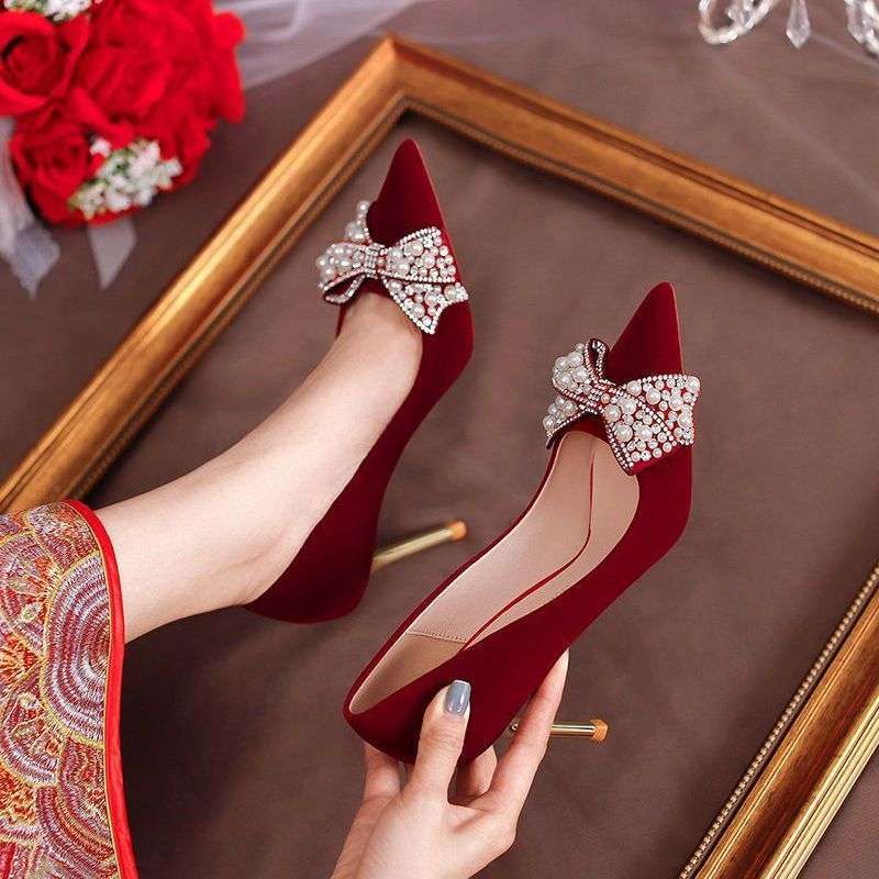 Gaun Pernikahan Sepatu Pernikahan Warna Merah Sepatu Pengantin Wanita Dua Pakai Gaun Pengantin Gaya Tinggi Gaya Xiuhe Wanita Pakaian Bersulang Sepatu Hak Tinggi Kaki Tidak Lelah