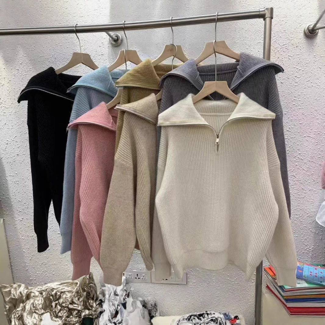 Dongdaemun Korea Pakaian Musim Gugur Model Baru Kerah Terbalik Elegan Longgar Warna Polos Kemeja Rajut Lengan Panjang Wanita