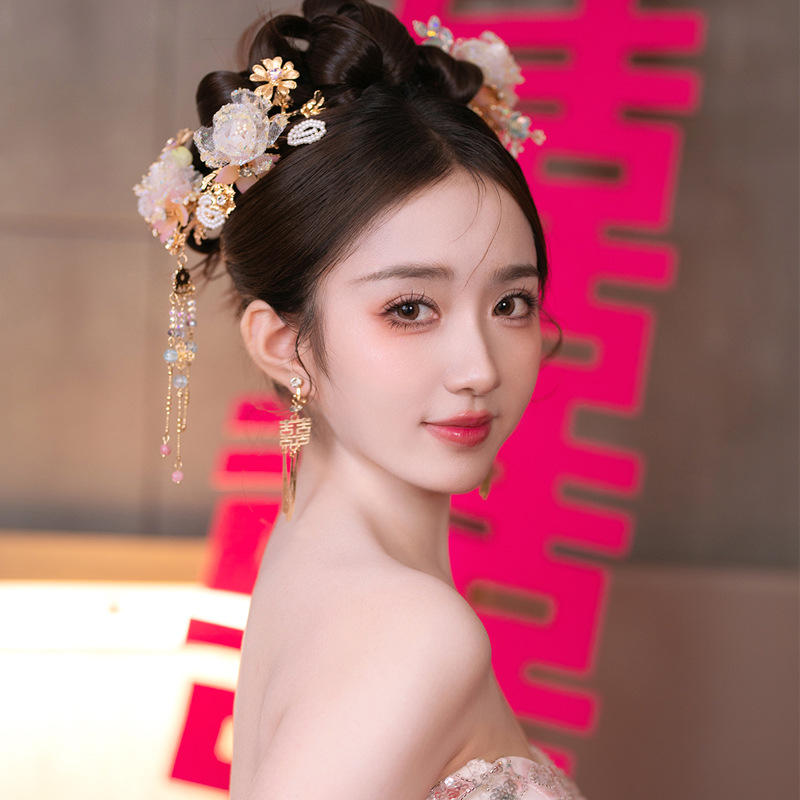 Xiuhe hiasan kepala pengantin Xiuhe, pakaian pernikahan baru gaya Tang langkah goyang hiasan kepala aksesoris rambut setelan retro