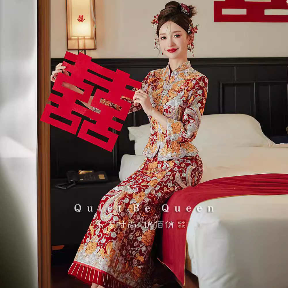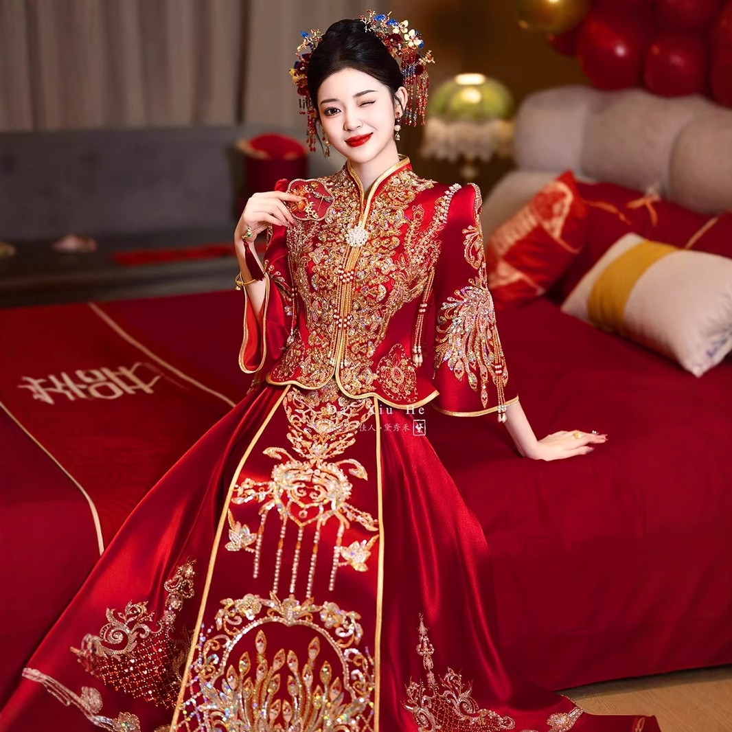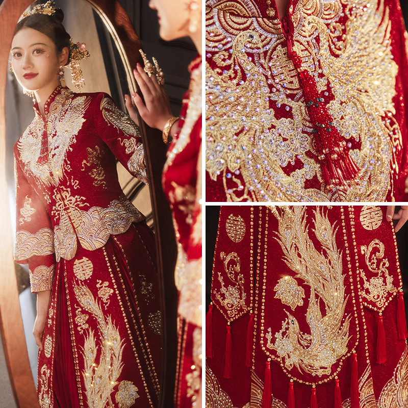 Gaun naga dan Phoenix, pakaian pernikahan wanita Roti Bakar baru Xiuhe pakaian industri berat slim-fit keluar pakaian gaun pernikahan untuk wanita 2024