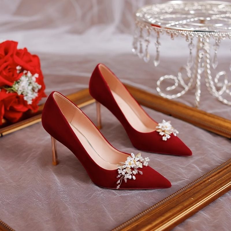 Sepatu pernikahan wanita, merah tidak lelah kaki sepatu pernikahan Xiuhe gaun dua arah pakaian musim gugur 2023 sepatu pengantin hak tinggi gaya Perancis