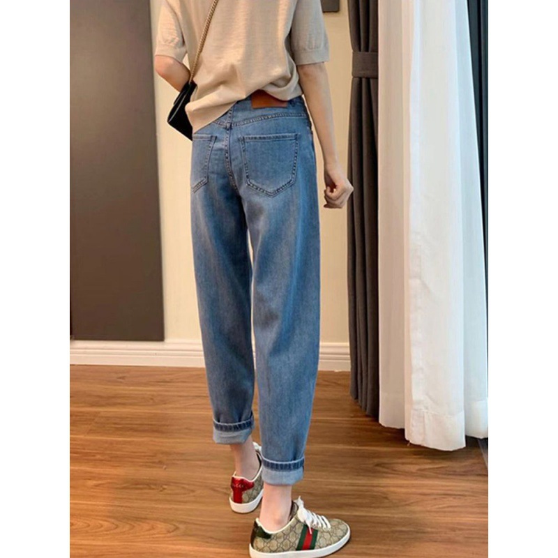 Celana jeans putih crop retro Amerika wanita, celana harem lurus longgar pinggang tinggi pelangsing ayah