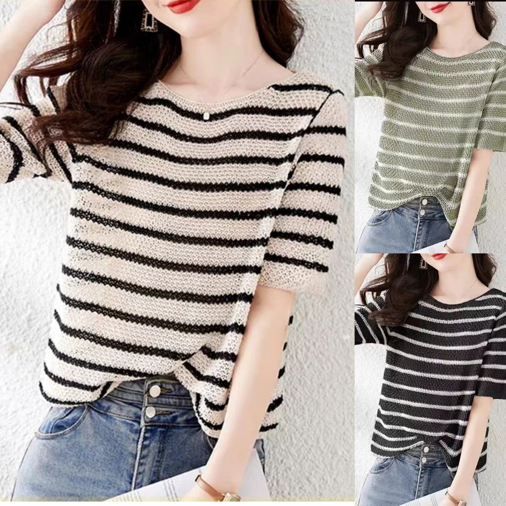 Kaus Rajut Kasual Modis Berongga Warna Kontras Motif Garis Lengan Pendek Model Baru Musim Panas 2025 Atasan Wanita Terlihat Kurus Longgar
