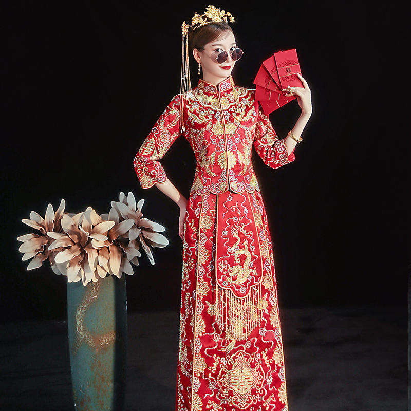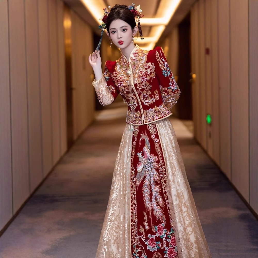 Setelan cheongsam Xiuhe, kelas atas gaun panggang baru pengantin pesta pernikahan kinerja kembali ke pintu perayaan festival catwalk