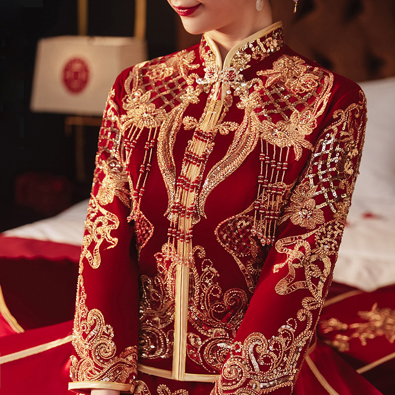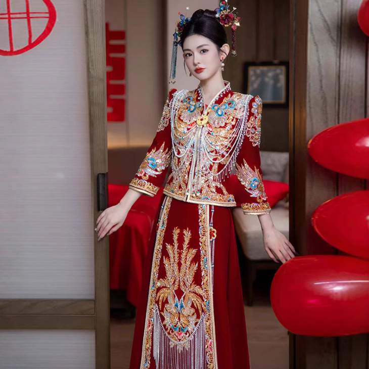 Gaun Xiuhe beludru tebal untuk pengantin wanita, gaun pesta pernikahan gaya Cina terbaru 2025, gaun pengantin untuk musim semi dan panas, grosir.