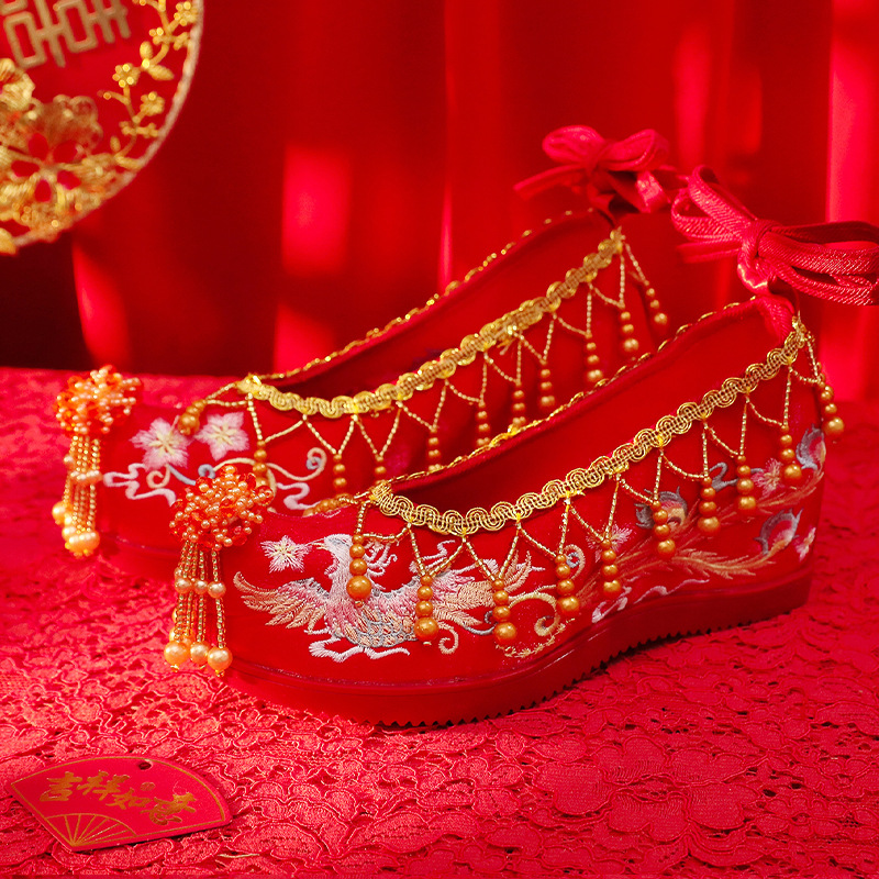 [Wajah Dasar Merah] Musim Semi Tahun Baru Sepatu Pernikahan Pakaian Xiu He Sepatu Bordir Gaya Kuno Rumbai Sepatu Pernikahan Pakaian Kuno Pakaian Han