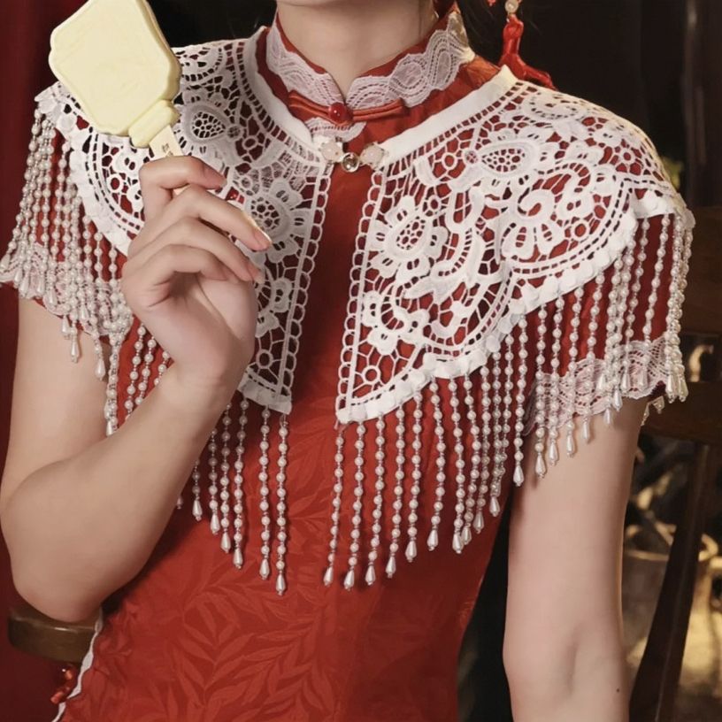 Bahu Awan Mutiara Rumbai Gaya Tiongkok Baru dengan Cheongsam Pakaian Bersulang Cheongsam 2025 Selendang Renda Membentuk Tubuh Gaya Nasional Model Pengantin