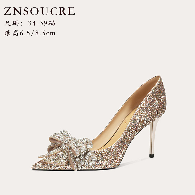 Xiuhe sepatu pernikahan, hak tinggi wanita hak stiletto kulit domba lancip pita berlian imitasi baru musim gugur