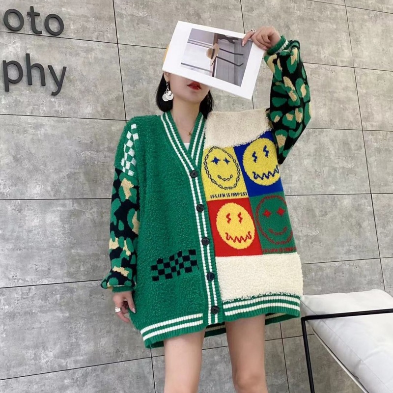 Mantel kardigan rajut wanita, mantel mode wajah tersenyum gaya malas musim gugur dan musim dingin model baru dipertebal, kardigan rajut motif macan tutul