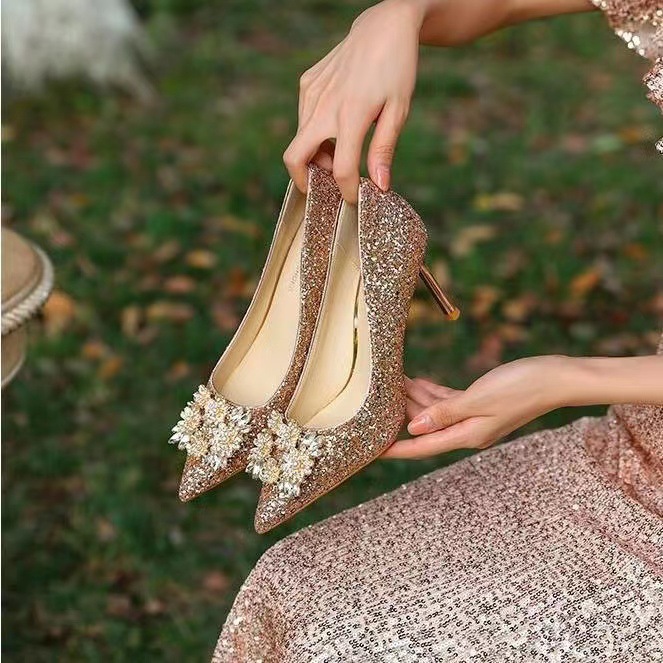 Sepatu 2023 baru musim semi dan musim panas payet serbaguna Xiuhe pakaian sepatu pernikahan Cina sepatu pengantin runcing hak tinggi hak stiletto wanita