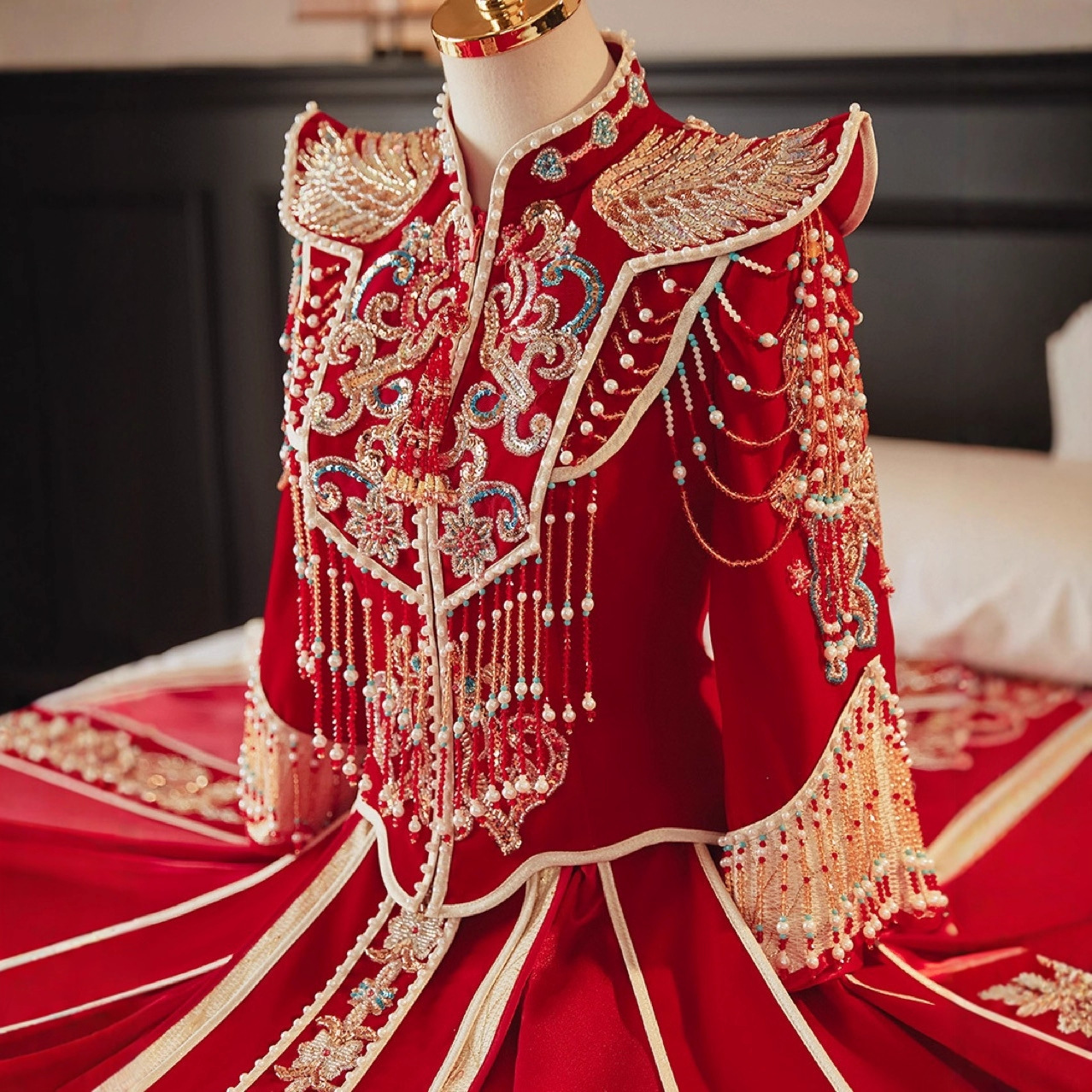 Baju Pengantin Gaya Cina Velvet Xiuhe 2025, Gaun Pengantin Bordir Berat Xiuhe Kimono, Pakaian Pengantin untuk Pesta, Pakaian Pengantin, Set Pasangan