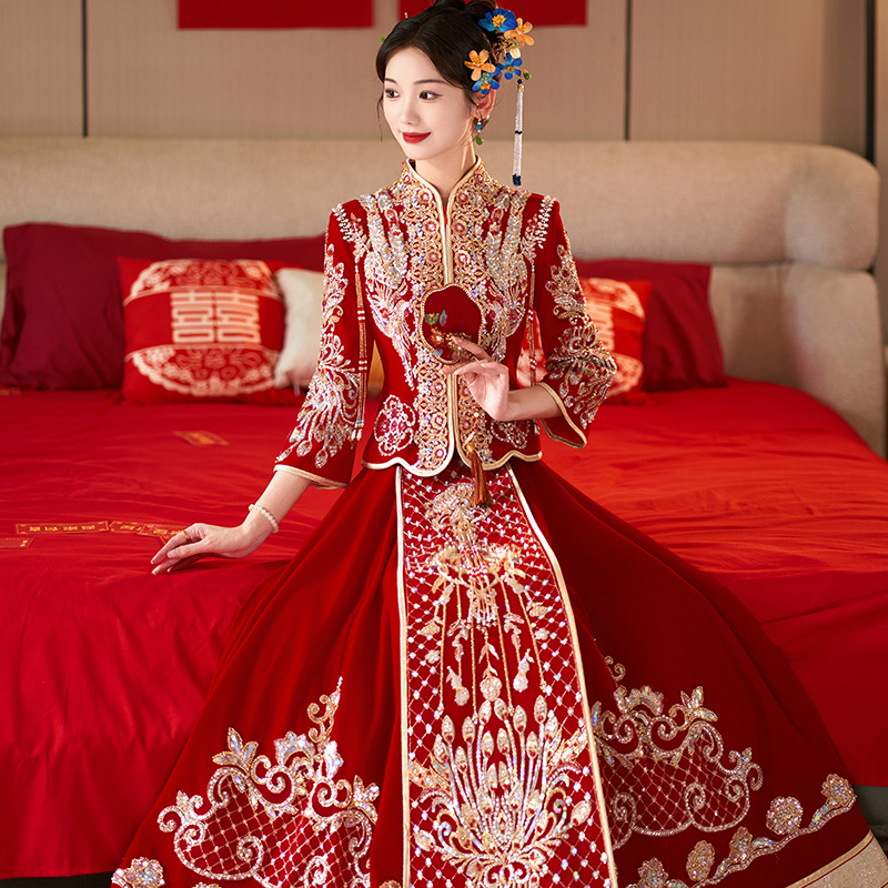 Bahu beludru Xiuwei pengantin wanita 2022, gaun pernikahan Cina baru ayunan mewah industri berat kelas atas