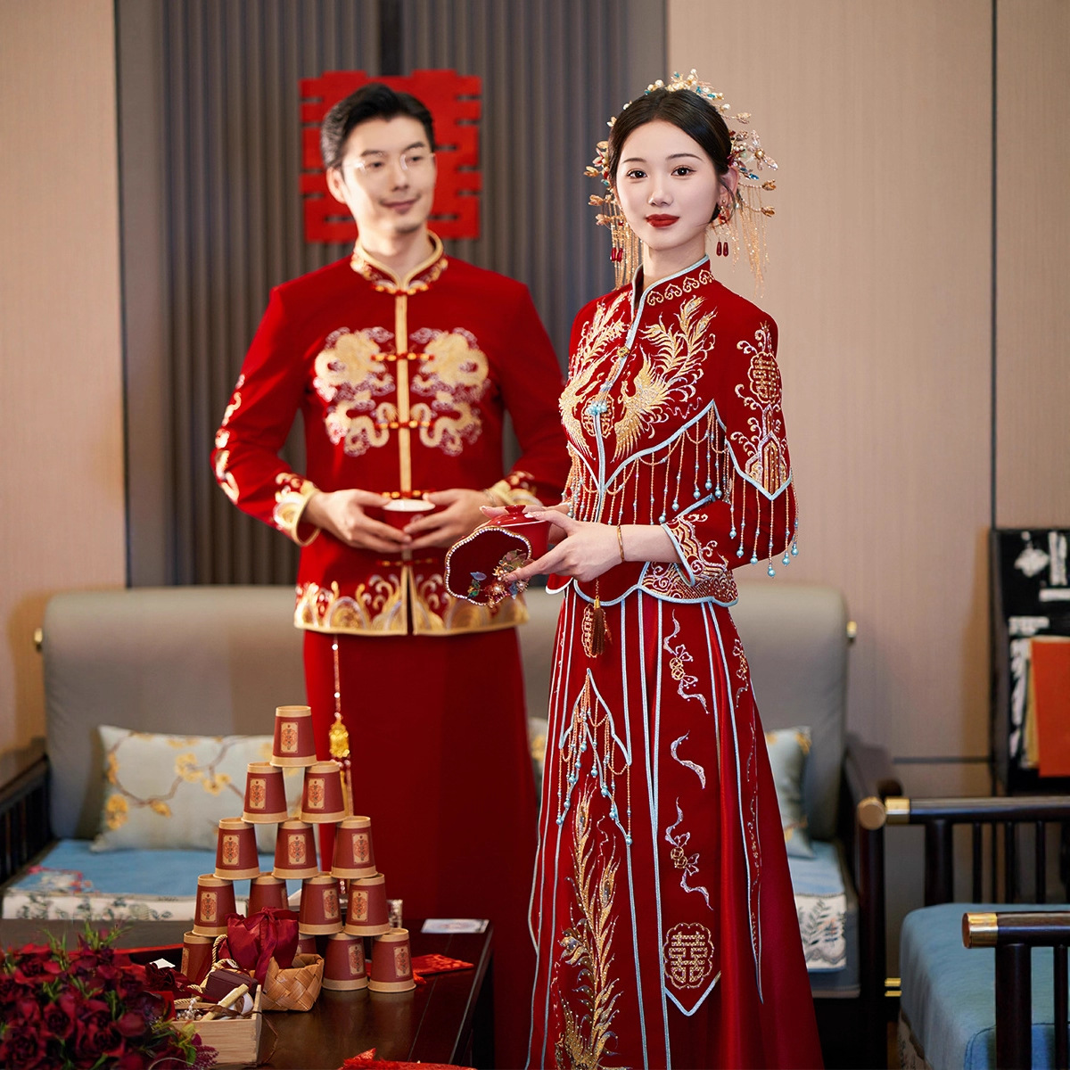 Pakaian Xiuhe Pakaian Pengantin Gaya Tiongkok Model Baru 2025 Pakaian Pernikahan Pakaian Pernikahan Pakaian Pengantin Setelan Pasangan Pria dan Wanita Memamerkan Pakaian Kimono Pekerja Berat