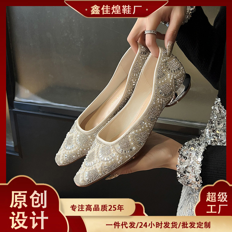 7318-36 Sepatu Tunggal Kepala Persegi Elegan Sosialita Berlian Imitasi Sepatu Pernikahan Hak Tebal Wanita Sepatu Sol Datar Xiuhe Cheongsam Nyaman