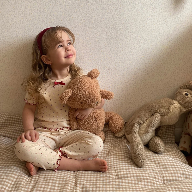 Setelan Piyama Anak-Anak Bayi Bernapas Katun Murni Versi Korea Pakaian Rumah Anak Laki-laki dan Perempuan Pakaian Rumah Tangga Simpul Kupu-kupu Bunga Cherry