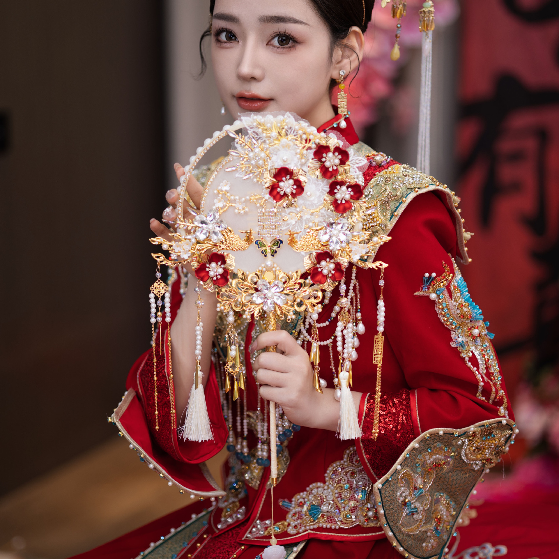 Grosir Pengantin Wanita Pakaian Xiuhe Kipas Pernikahan Buatan Tangan Aksesori Pakaian Pernikahan Gaya Tiongkok Kipas Produk Jadi Dua Warna Merah Emas 9204