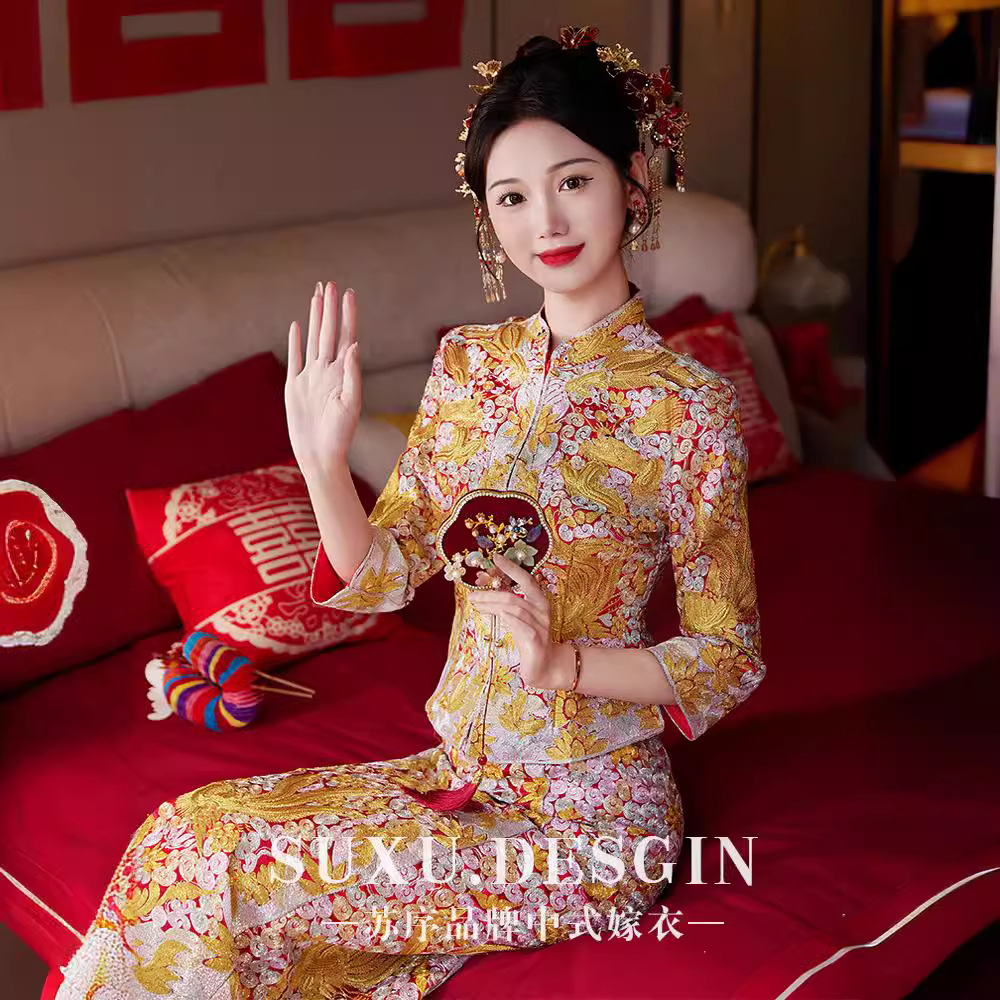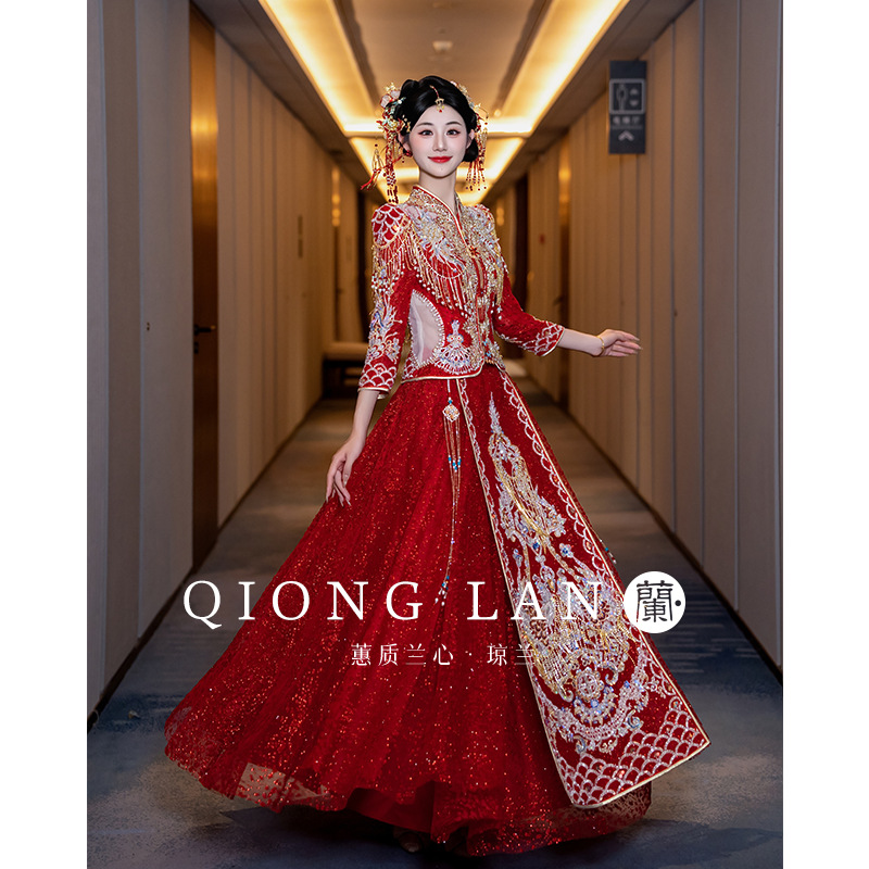 Qiong Lan Pakaian Xiuhe Musim Panas Pakaian Pernikahan Pengantin Wanita Model Baru 2025 Pakaian Pernikahan Gaya Tiongkok Gaun Panjang dan Phoenix Pakaian Pernikahan Pertunjukan Pria Kecil Kimono