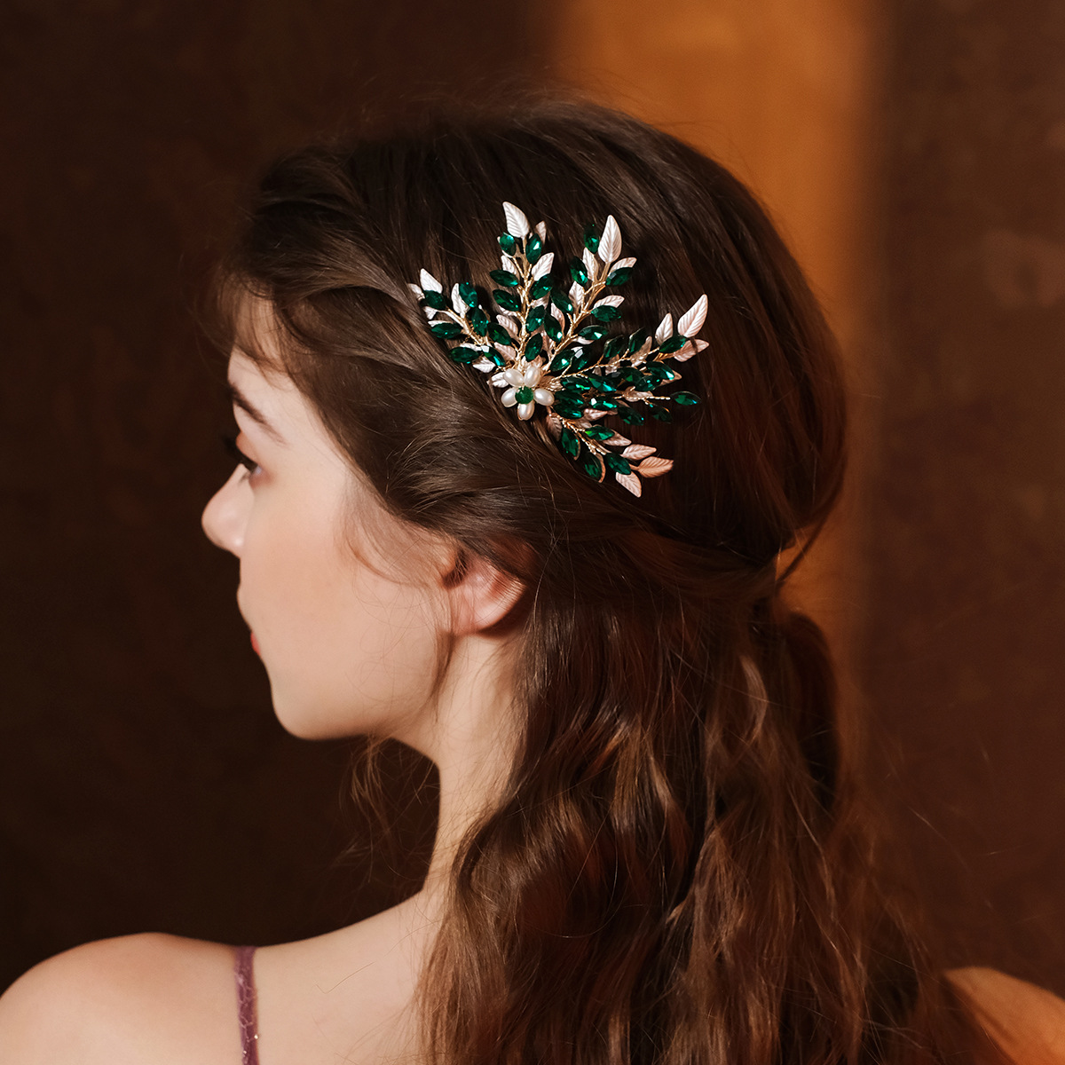 Aksesori rambut wanita, gaun pengantin retro Eropa dan Amerika, sisir rambut berlian imitasi hijau buatan tangan yang indah
