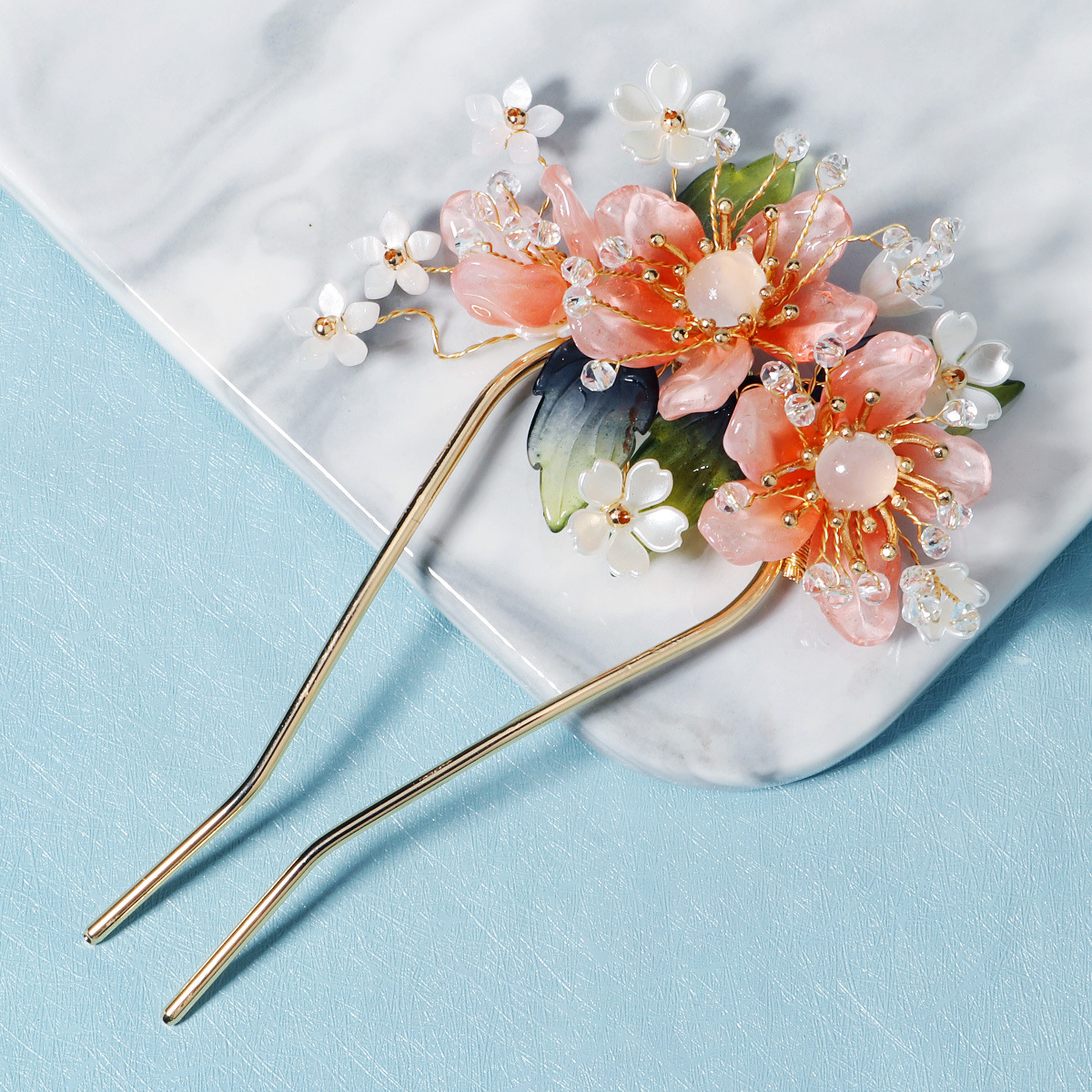 Aksesori rambut gaya kuno gaun pernikahan bunga persik Hanfu updo pin Xiuhe pakaian cheongsam resin bunga jepit rambut kristal hiasan kepala