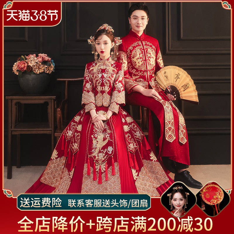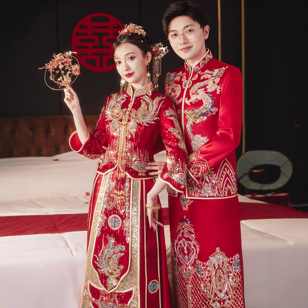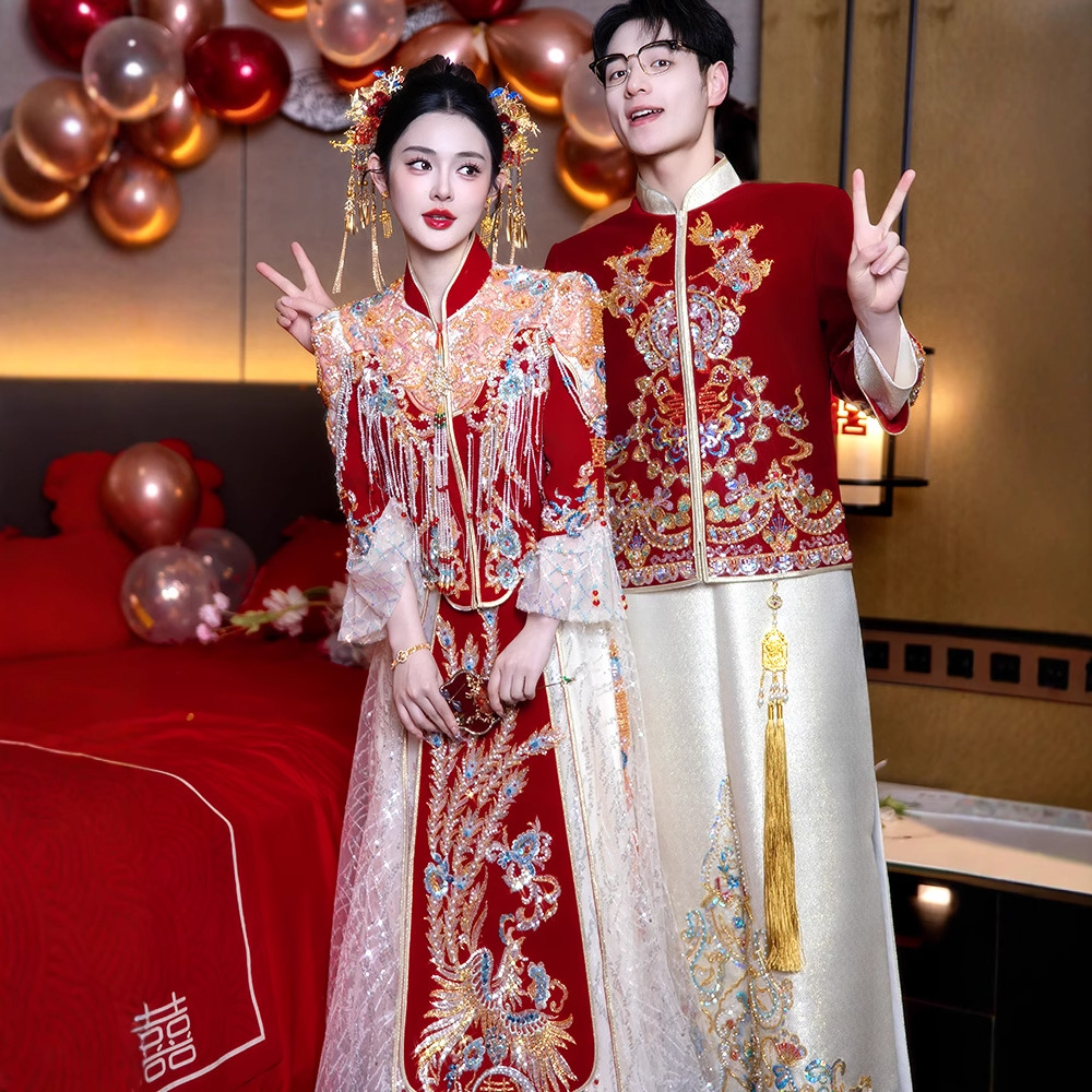 Xiuhe gaun pengantin wanita, setelan pasangan pakaian pernikahan rumbai Xiuhe slim fit pelangsing 2024