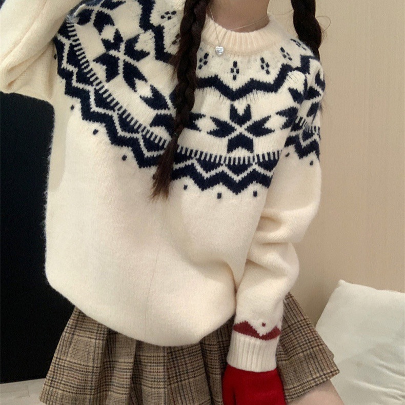 Sweater pullover jacquard warna-warni Fair Isle untuk wanita, atasan rajut longgar dan lembut bergaya santai untuk individu bertubuh mungil.