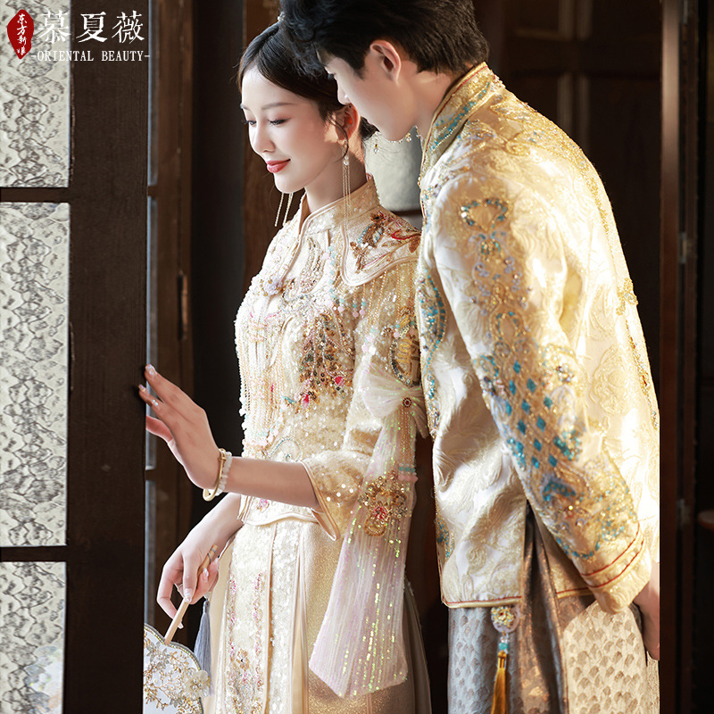 Gaun Pengantin Xiuhe Clothing 2025 Musim Panas Terbaru, Tipis, Warna Emas, Gaya Cina, Bordir Berat.