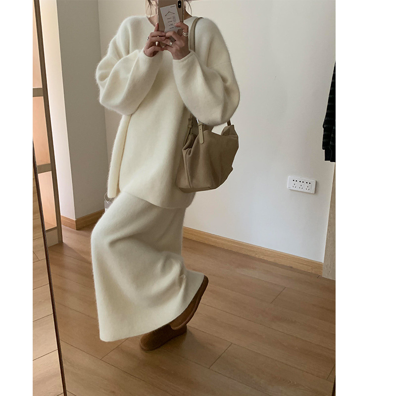 Setelan Rajutan Gaya Lembut Korea Wanita Kardigan Desain Baru Musim Gugur Musim Dingin 2025 Rok Setengah Badan Dua Potong