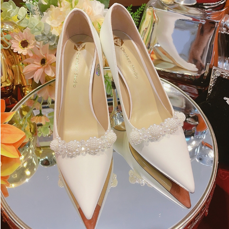 Sepatu pernikahan Prancis Xiuhe gaun pernikahan utama, pakaian dua arah pengantin kaki tidak lelah 2023 baru hak tinggi putih hak stiletto wanita