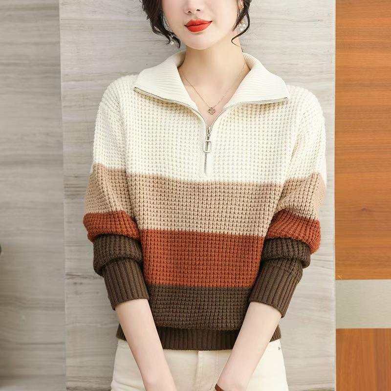 Pakaian Musim Gugur dan Musim Dingin Sweater Kerah Terbalik Setengah Ritsleting Model Baru Atasan Rajut Warna Kontras Tebal Gaya Malas Wanita Kemeja Bottoming Garis-Garis Longgar