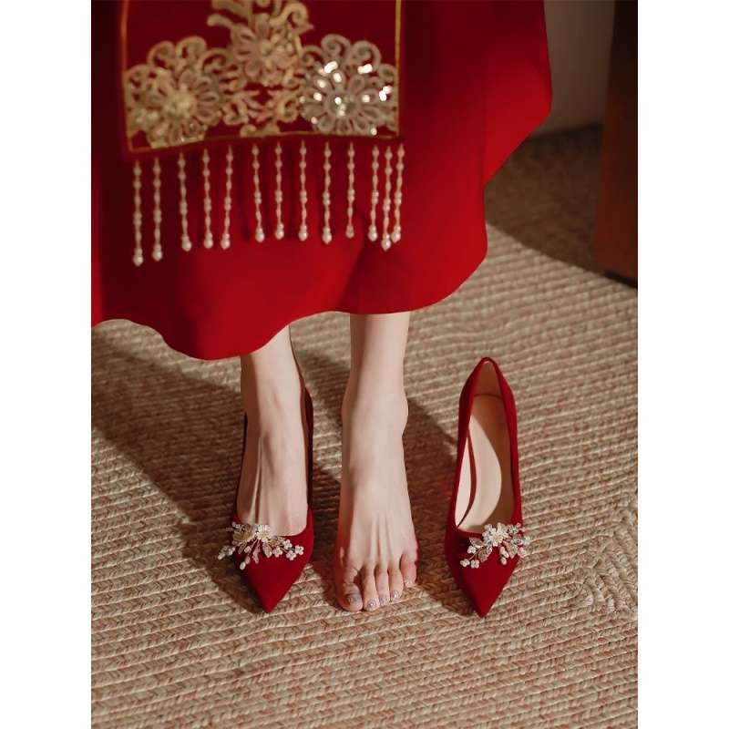 Sepatu Pernikahan Warna Merah Pakaian Xiuhe Wanita Sepatu Pengantin Wanita Dua Pakai Gaun Pengantin Wanita Bisa Pakai Sol Datar