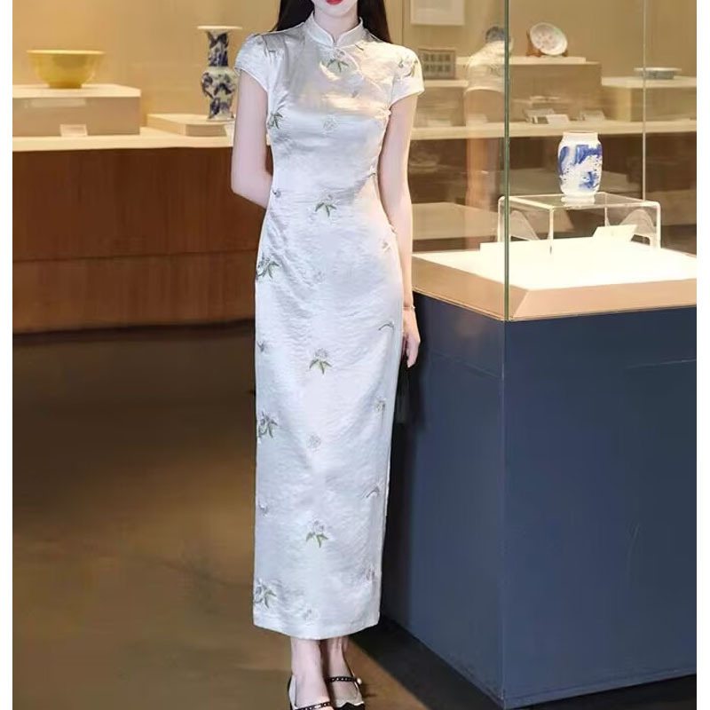 2024 musim semi dan musim panas baru Jinhe crepe cheongsam panjang elegan artistik retro gaya Cina wanita