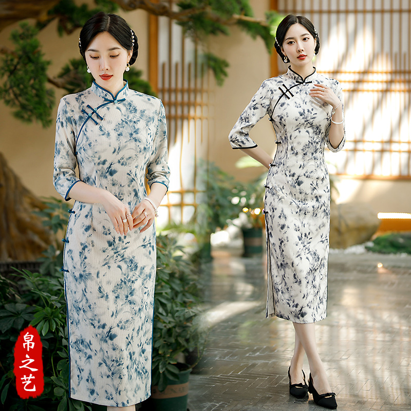 2024 musim semi dan musim panas baru Pansy kerut sisi Delapan kancing dicetak panjang tinta cheongsam lukisan maju optimalisasi baru cheongsam Cina