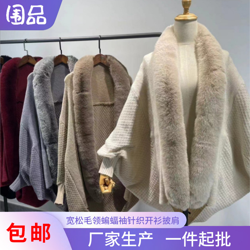 Kardigan rajut kerah bulu wanita, mantel Luaran syal lengan kelelawar musim gugur dan musim dingin 2023
