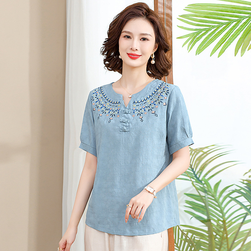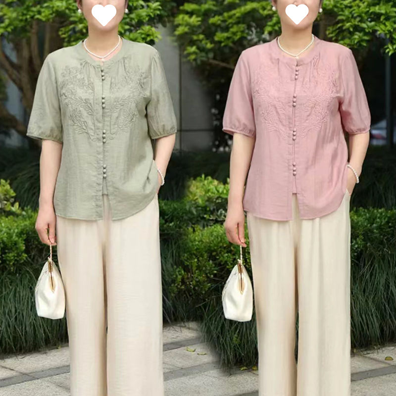 Kemeja Bordir Warna Solid Modis Model Baru 2024 Atasan Kardigan Lengan Pendek Musim Panas untuk Ibu Setengah Baya dan Tua Gaya Tiongkok Baru