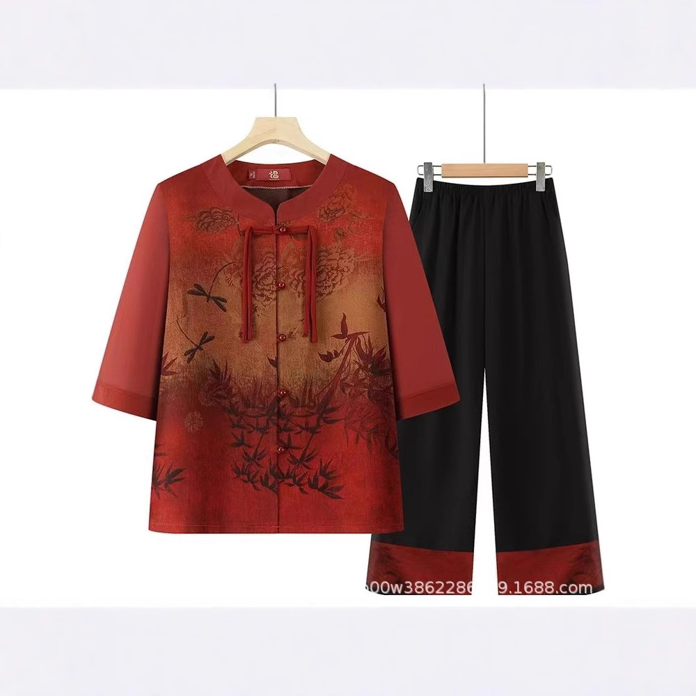 Setelan Ibu Model Baru Musim Panas Setelan Nenek Lengan 7 Poin Gaya Nasional Kemeja Wanita Paruh Baya Gaya Barat Modis Longgar
