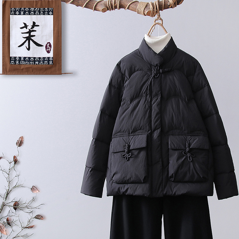 Ibu jaket hangat kerah berdiri gaya China, jaket hangat kerah berdiri wanita usia sedang retro gaya Barat putih bebek bawah musim dingin